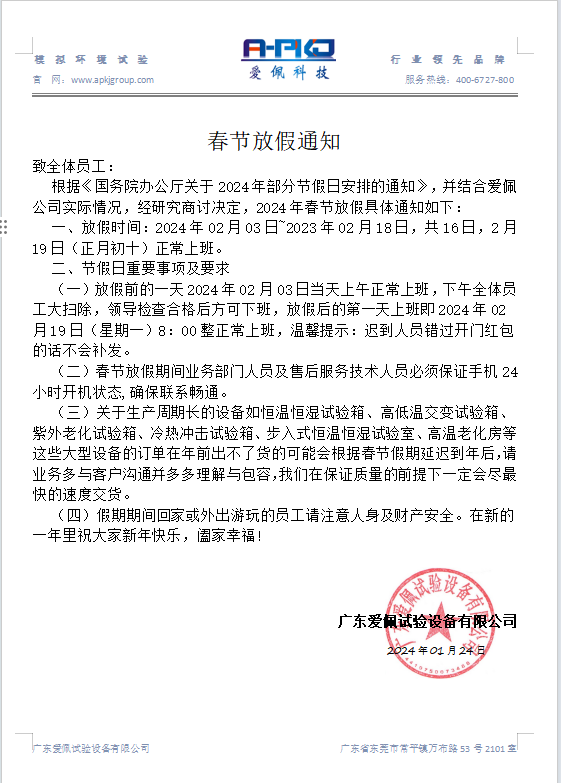 - 廣東愛(ài)佩試驗(yàn)設(shè)備有限公司春節(jié)放假通知